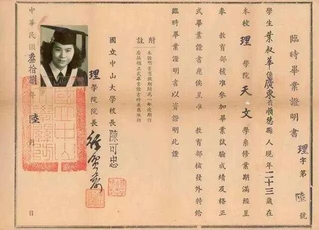 叶叔华,1927年出生于广东省广州市。1949年毕业于中山大学数学天文系。1951年,进入中国科学院紫金山天文台徐家汇观象台。1980年,当选为中国科学院学部委员(院士)。1981年,任上海天文台台长。