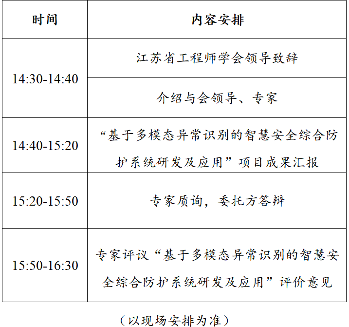 各有关单位、有关专家: 由南京中谷芯信息科技有限公司、中通服网盈科技有限公司、南京邮电大学、南京芯视元电子有限公司和苏州安芯智联科技有限公司共同完成的“基于多模态异常识别的智慧安全综合防护系统研发及应用”项目,已完成预定的各项研究任务,取得了预期的研究成果,具备了进行科技成果评价的条件。现收到项目完成单位的申请,按照《江苏省工程师学会科技成果评价管理办法》相关规定,我会定于2025年8月29日召开项目科技成果评价会。现将有关事项通知如下: 一、会议时间 2025年8月29日(周五)14:30-17:00 二、会议地点 南京市雨花台区软件大道106号 三、会议议程 四、联系人及联系方式 联系人: 朱晓蓉(电话、微信:13585107708) 蔡宗雅(电话、微信:15895996090) 盛 伟(电话、微信:13770522785) 邮 箱:jsie2014@vip.sina.com Q Q:1485589911 江苏省工程师学会 2025年8月26日